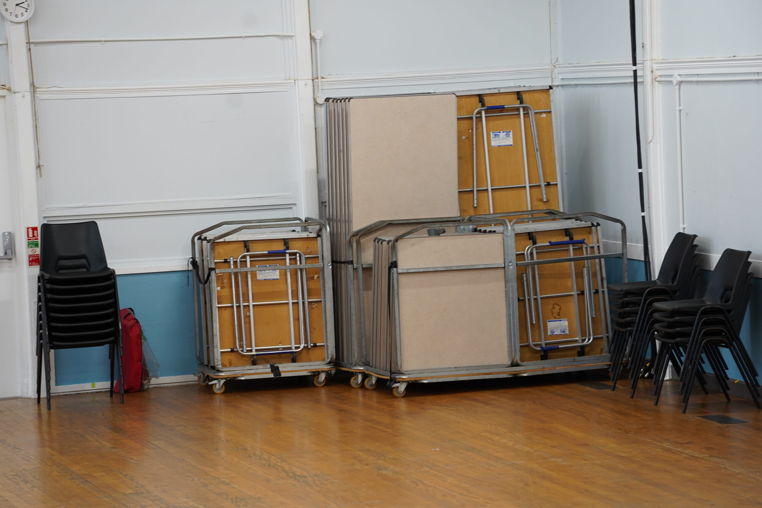 The folding chairs are kept in the cupboard at the end of the main corridor adjacent to the ladies toilet and you will need to arrange these in advance. They are stacked on two trolleys and there should be 40 per trolley secured by a trolley belt. Again for Health & Safety reasons, we keep the folding chairs in the cupboard when they are not in use